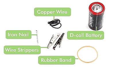 Gather your materials. Before you can make an electromagnet, take a moment to gather your materials. You will need the following: An iron nail that is 15 centimeters long Three meters of 22 gauge insulated copper wire At least one D-cell battery A pair of wire strippers, which you can pick up at a local hardware store A rubber band