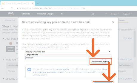 Set up your key pair when prompted. The key pair can be used as a more secure alternative to a password. If you have a key pair already, you can use the existing one. Otherwise, create a new key pair. You will need to download a .pem file onto your computer. On your hard drive, create a folder for your server. Inside that, make a folder called "ssh." Save the key pair into this folder. Make sure you know where you saved your key pair. If you lose it, you won't be able to log into your server anymore.