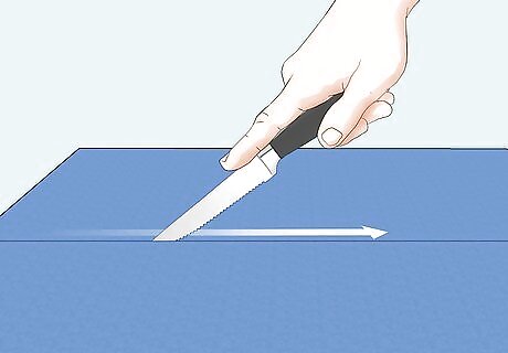 Continue making smooth cuts until you slice through the foam pad. Once you've scored the foam, continue running the blade along the mark you made. Each cut should as smooth of a motion as possible. Don't push down hard with the knife—just let the weight of the blade do the work on each pass. If you need to, make several passes until the knife slices through the bottom of the foam. Do not press down on the foam while you're cutting. That will change the shape of the foam, making your cuts uneven. If you're using a long enough knife blade, you should be able to easily cut through the bottom of the foam pad without having to compress the foam. Make gentle sawing motions if you're using a serrated knife, but don't press down hard.