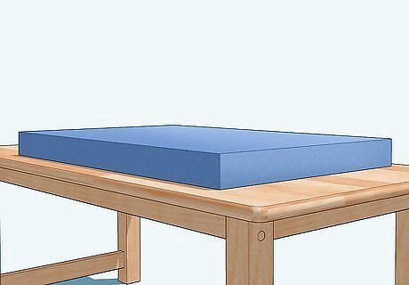 Place the foam on a covered, sturdy surface. Find an area that's big enough to hold your entire foam piece, like a large work table. Then, cover the table with a tarp, blanket, or towel. This will make cleanup easy, since the towel will help catch any small pieces of foam that fall off when you're cutting. Make sure you choose a surface that won't be damaged by a sharp blade or heat if you're using a hot wire cutter, like a wooden or metal table. If you don't have a table large enough to work from, place a sheet of plywood or a large sheet of flattened cardboard on the floor. This will protect the floor while catching any foam that falls. If the foam is hanging off of your work surface, the weight might cause the piece to shift while you're cutting. To protect your hands during this project, consider wearing cut-resistant gloves if you have them.