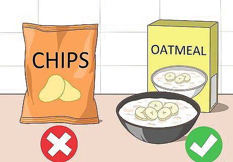 Stick to healthy foods. If you experience cravings for salty or sweet foods, try to resist them. While it’s normal to have cravings during your period, you’ll feel physically better if you try to eat healthy. Since prolonged periods can take up a significant part of each month, try making healthy eating your norm instead of the exception. Bananas and oats are thought to fight cramps, so you could have oatmeal with a sliced banana. Avoid salty foods, like chips, as they can increase bloating.