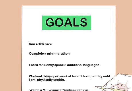 Set goals for your future. Another great way to move forward from regret is to set goals for your future. By setting goals for yourself, you can give yourself something to work towards rather than constantly beating yourself up over past mistakes. Try to relate your goals to what you regret in some way. For example, if you regret not making more time for your hobbies because of your personal and professional obligations, then make a goal to dedicate one afternoon per week to your hobbies. Make sure that the goals you set are realistic and manageable. For example, it might be overwhelming to set a goal to learn to speak French fluently by the end of the year. However, you could set the goal to take a French class or listen to language instruction CDs during your commute.