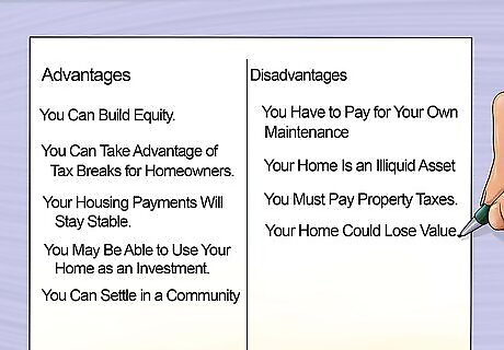 Make a pro and con list to come to a decision. Once you are armed with all of the information, calculations, and considerations related to buying and renting a home, you are ready to come to a decision. Making a simple pro and con list may help. In one column, write all of the advantages (pros) of renting a home. In another column, write all of the disadvantages (cons) of renting. Create another list of the advantages and disadvantages of purchasing a home. Review your lists, thinking carefully about each aspect, until you are ready to make a decision.