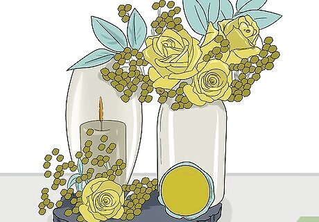 Place flowers and candles in mason jars for an easy, rustic look. Mason jars are a simple, cost-effective way to decorate your tables. Use large ones to hold floral arrangements and small ones for simple stems and small candles. Dress them up with decorative rope, ribbon, or spray paint (pick one of your accent colors). Consider stringing together mason jars with twine or thin rope and hanging them from beams or wall sconces. This will look boho-chic in a barn made of light ashy wood, but mason jars will look great in with any type of wood.