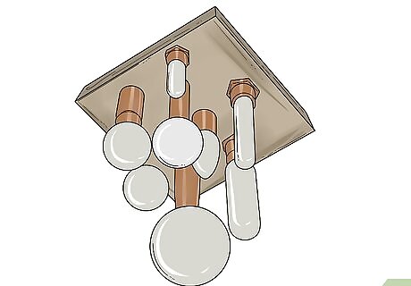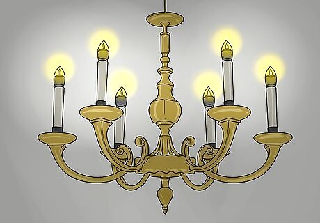 Install an ornate chandelier for a touch of decadence. If your budget allows, use a large chandelier (or multiple small chandeliers) to light the barn. The intricate design of the chandelier will add luxury, romance, and charm to your design scheme. Be sure to ask the property owner before you install a light fixture because it will likely require putting holes in an overhead beam or wrapping a chain around a beam (which could cause damage). Combine the chandelier with twinkle lights to up the charm.