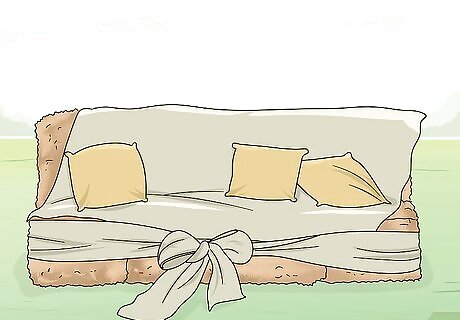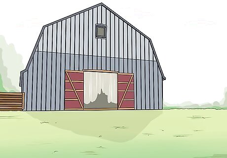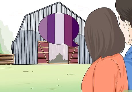 Stack hay bales to make a perfect farm-themed photo setup. Stack a few bales of hay together to give your guests some set pieces to work within the photo area. Stack 2 or 3 for the backdrop or toss a decorative blanket over the top of 1 or 2 for a makeshift bench they can pose on. You can buy bales of hay at farm supply stores and some garden supply stores. If you live in a city center, you may need to drive out to a near-rural area to find these places.