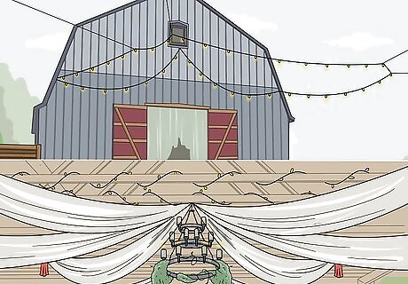 Drape sheer linens from the barn’s wood beams. Sheer white linens will create a cozy-yet-lush environment for your wedding. Leave them in long, flowing lines or spread the linen out to frame the tables and complement the symmetry of the barn. Alternatively, if the barn has a large garage-style door or big sliding doors at the front, hang the sheer linens like curtains to add a romantic, dreamy look to the entrance. You’ll probably need a ladder or two to drape them over the beams and position them in the perfect way. White linens will brighten up barns made from darker wood while dark, sheer linens will add a sense of romance to any shade of wood.