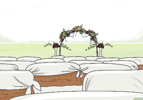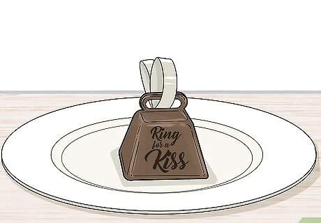 Place small cowbells on the tables for your guests to ring. Cowbells are a cute way to incorporate a farm theme into your wedding. Your guests can ring them when the time comes to make toasts or whenever they want to urge you and your partner to smooch! Consider painting a note on the bell that says: “Ring for a kiss!” You can purchase cowbells online or at most craft stores. If you have long communal tables, place a cowbell every 5 to 10 chairs. For smaller tables, 1 cowbell per table will suffice.