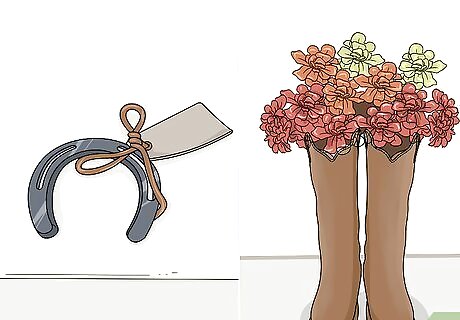Add a few fun items to stay true to a western or farm theme. If you’re going for a full-on farm theme, consider decorating the space with knick-knacks like cowboy boots, pitchers, animal figures, old Coca-Cola bottles, horseshoes, and wheel spokes. Keep it simple with a maximum of 2 or 3 items total—too many true-to-theme items can look kitschy. For instance, place an old-fashioned watering pitcher or a cowboy boot on the welcome table—you can even use it to hold sparklers for your send-off! Place horseshoes on top of folded napkins for table decor (just make sure they’re clean).