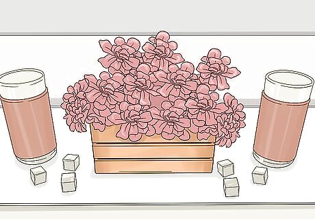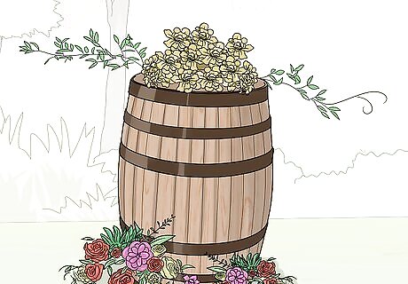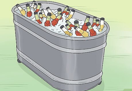 Fill an antique metal trough with ice and your favorite refreshments. Let your guests serve themselves by stocking an old metal trough with ice-cold refreshments. Place the trough near the hors d'oeuvres station so guests have easy access. Fill the trough with water beforehand to check for leakage so you know there won’t be moisture damage on the wood beneath. You may be able to find a metal trough at an antique store or you can search online. If you can only find a wood trough, fill it with flowers instead so you don’t damage the wood. Pick a wooden trough in a shade that matches the undertones of the barn (e.g., a rich chestnut wooden trough pairs well with a dark walnut colored barn).