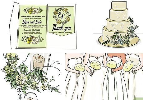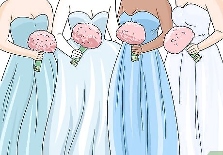 Select 2 or 3 accent colors to complement your base color. Mixing warm and cool tones together can add some excitement to the decor and keep it from looking flat or drab. Accent colors will appear on linens, stationery, centerpieces, flower arrangements, and any other small knick-knacks you want to incorporate. Don't choose more than 3 accent colors because that can look too busy and disrupt the theme. Accent colors may also tie in with the attire of your wedding party. For instance, the floral arrangements might match the bridesmaids’ dresses or the groomsmens’ ties or pocket squares. Warm golden yellow is a great accent color for light blue, rose, green, and plum (especially with dark, neutral, or cherry colored wood). Pops of bright red are a classic accent to white, champagne, green, and pink colors. This color scheme will add a luxurious feel to barns with cherry, dark, blonde, neutral, or walnut wood.