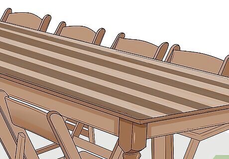 Skip the tablecloths if the venue provides charming wood tables. Let the wood of the tables shine through in all their rustic glory by foregoing tablecloths. Make sure the different types of wood share the same undertones. For example, chestnut and walnut woods are a good match because they both have red undertones. On the other hand, a blonde-colored wood table would look awkward in a light silver ash barn. Consider the following wood pairings: White oak and walnut Walnut and maple Red oak and white ash Mahogany and cherry Mahogany and maple Cherry and maple