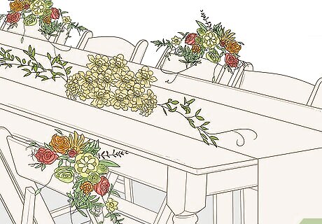 Drape tables and chairs with garlands and greenery to bring nature inside. Barns blur the line between the outdoors and the indoors, so decking out your venue with greenery is a perfect way to complement its natural aesthetic. Consider using strings of ivy to decorate the tables or walls or let them hang down from horizontal beams. You can find faux-garlands at any craft store or order them online. If your budget allows, a florist can also sell you strings of ivy or greenery. Choose light green ivy for dark wooden barns and dark green vines for neutral or silver ash wood.