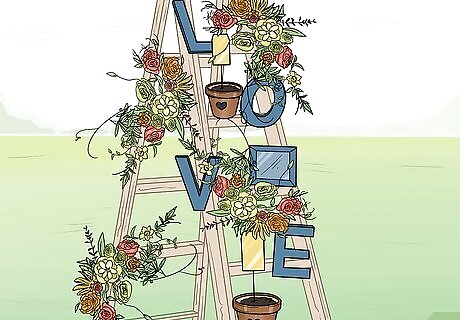 Use an antique step ladder to hold signs, cards, or decor. Standing ladders are beautiful in their own right and give the idea of climbing towards some goal (like you and your partner tying the knot!). If the venue has an old ladder lying around, ask if you can use it to display signs, photos, seating cards, or floral arrangements. You can also look on Craigslist to pick up an old ladder or head to an antique shop.