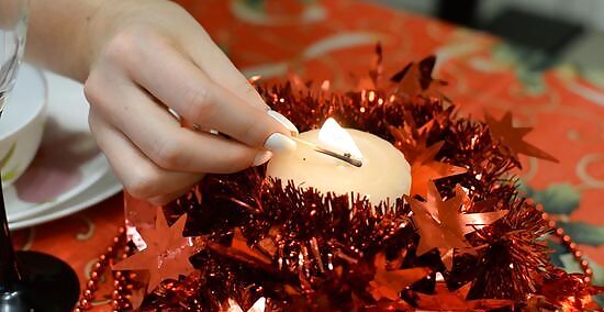Light unscented candles to add elegance. Keep the candles in holders and space them out evenly across the table. Make sure they are unscented since you don’t want their smell to mix with the smell of your food. Light them before you eat to add ambiance to your meal. Stand multiple cinnamon sticks on end around a large candle and tie them with a red or green ribbon to add more decoration. Use LED candles if you don’t want real flames on your table.