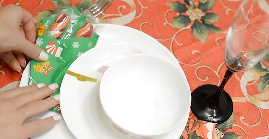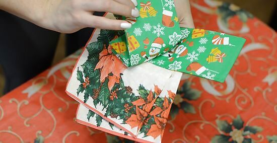 Use cloth napkins or festive disposable ones. Cloth napkins make a great impression during special occasions. Fold the napkin into a design for each person at the table to add extra flair. If you want to use disposable napkins, look in the seasonal holiday aisle at your local store to see if they have any napkins with printed designs. Save extra napkins from past Christmases to reuse the following year! When in doubt, plain white napkins will work just fine.