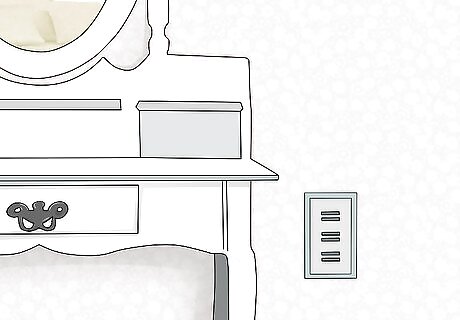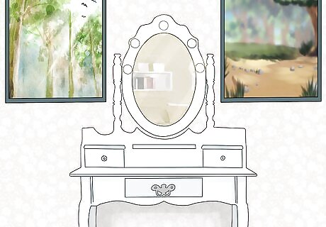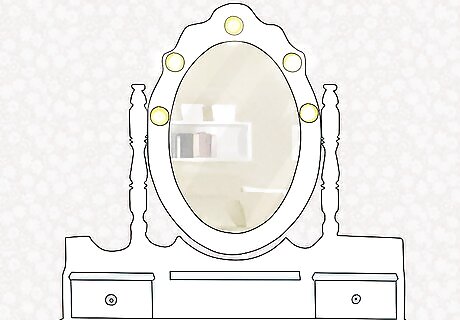 Utilize multiple lamps for consistent lighting. Rather than relying on a single light shining off to the side, position one at either end of your vanity and switch them both on while you’re putting on your makeup. Twin light sources provide illumination from both sides, which can keep you from ending up with uneven eye shadow or the wrong shade of foundation. Soft white bulbs tend to provide the best conditions for applying makeup. Fit your lamps with adjustable shades to cut down on glare. Overly intense lighting can also throw off your brush hand. A soft desk lamp centered above the table will also give off a modest yet revealing glow.