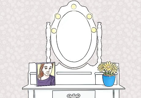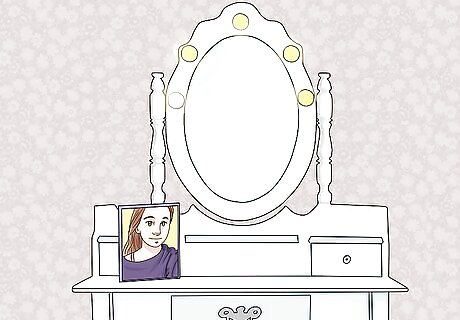 Set out some photos. Place a few framed pictures of your loved ones along the rear edge of the table where you can glance at them while you’re getting ready. Since your dressing table is one of the main focal points of the bedroom, it makes a great place to show off your spouse, children, or pets. Be sure to situate framed photos someplace where they won’t accidentally be knocked over and broken.