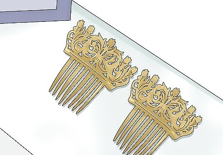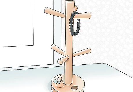 Put your prized jewelry on display. Invest in a set of sleek holders to highlight your collection of bracelets, necklaces, and rings. Not only will this spare them the fate of being lost in a drawer somewhere, it will also keep them together for comparison when you’re deciding on a piece to pair with the evening’s outfit. Choose holders and similar displays that are in keeping with the style you’ve chosen for your dressing area. Minimalistic holders in bold colors and abstract shapes will seem to rise right out of a sleek, modern desk, for instance, while a hand-carved wooden rack will look right at home on a rustic mahogany table. Jewelry can make a dazzling decorative touch on its own, even if you rarely get a chance to wear it.