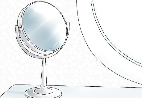 Make use of a separate makeup mirror. These smaller mirrors magnify your reflection slightly, which can come in handy for detail-oriented tasks like applying mascara, tweezing, and checking for blemishes. Clear some space near the center of the table where you'll have no problem focusing on your finer features. You can move your mirror around as needed to make room for other supplies. Look for makeup mirrors in shapes, sizes, and frame materials that complement your other furnishings. Many makeup mirrors also include convenient built-in lighting elements, eliminating the need to tilt your face at impossible angles or rely on a harsh overhead fixture.