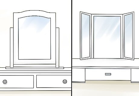Get creative with your main mirror. If your dressing table is going to be primarily a decorative fixture, look at a variety of styles to find a replacement that matches the sensibilities you’re expressing. You could also trade in a large central mirror for several smaller ones to establish a busier look, or install an elaborate folding mirror that lets you view yourself from different angles. For a centerpiece that's truly one-of-a-kind, play around with mirrors fashioned from other objects, like a repurposed painting, oversized clock, or vintage window frame. If you're the crafty type, you could even try putting together one of your own. Keep in mind that the mirror you settle on should be the right shape and dimension to give you a good look at yourself from where you’ll be sitting.