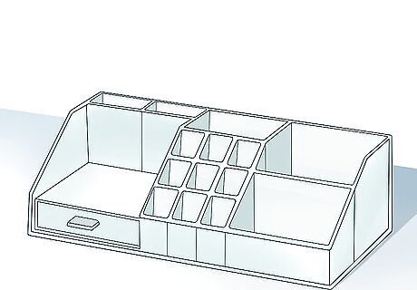 Use an organizer to store your makeup. These helpful tools feature compartments of various sizes that make it easy to stash your powders, pencils, creams, and brushes in a single convenient container while keeping them neatly separated. Configure the items in your organizer by tone, or group like products together to streamline your morning routine. Hiding the organizer in a drawer may help reduce clutter, though many are unassuming enough to be left out in plain sight. Some organizers are designed with flair in mind as well as functionality. Keep your overarching theme in mind when picking out one of these decorative storage aids to make sure it's a good match for the rest of your decor.