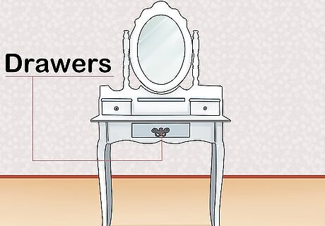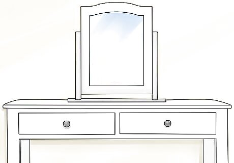 Pick out a table that suits your needs. Almost any type of compact table or desk can be appropriated for this purpose, so explore several different options and go with one that looks the most natural in the space you’re decorating. It’s also worth putting some thought into any additional features you might want, like drawers, cabinets, or built-in lighting elements. The table you choose should be low enough to avoid looking out of place for it’s intended use, but high enough to sit at comfortably. Extra storage space can be a major plus if you have a habit of stockpiling cosmetics or prefer to keep all of your beauty supplies in one place.
