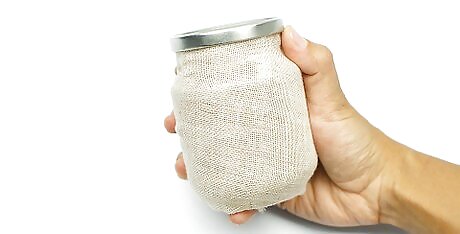 Add a doily or lace for a cottage-ready storage jar or flower vase. Using the doily or lace of your choice, begin by laying the fabric flat on a protected surface. Using a glue gun, apply a thin layer of glue evenly across all of the edges and most of the fabric. Carefully, pick up the fabric and place it where you want it on your Mason jar. Hold it in place for at least 30 seconds to ensure that it is securely in place. Let it dry according to the instructions for your glue. Make sure that you use a doily or lace that is suitably sized for your Mason jar. In general, the best size is one that covers the jar fully without having to be cut. Doilies and lace fabric are very delicate, so it is best to cut as little as possible to avoid unraveling. While it is recommended that you use a hot glue gun to securely adhere fabric to your Mason jar, you can also use a craft adhesive suitable for glass. Apply carefully with a small paint brush.