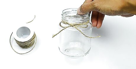 Wrap with string, ribbon, or twine for a quick and easy Mason jar decoration. Measure the circumference of the part of the Mason jar you wish to adorn (this could be the neck of the Mason jar, the part right below where the cap screws on, or the body of the jar, the thickest part of the jar). Cut your string, ribbon, or twine approximately twice as long as the circumference you measured. Wrap around the jar and secure tightly with a decorative knot or bow. You may want to trim your string, ribbon, or twine after you have secured it around the Mason jar if too much excess hangs down. If you want a rustic farmhouse vibe but want a thicker option, consider cutting a 1 inch (2.5 cm) to 2 inches (5.1 cm) strip of burlap or lace to use instead of string, ribbon, or twine.