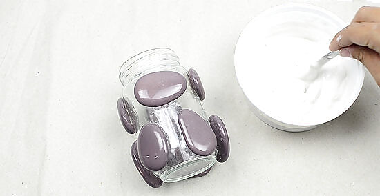 Smear grout onto your mosaic. Using your hands or a small craft knife, cover all the mosaic-ed areas on your Mason jar with grout. Don’t worry about covering up your mosaic pieces – you will be washing these off later. Make sure that you use enough grout to get into all the crevices. Let the grout sit for 20 to 30 minutes, or the length of time specified on the label. Most craft stores sell mosaic grout that is pre-mixed and ready to use. If you do not purchase a pre-mixed grout, mix your mosaic grout by following the instructions on the label. If you are applying grout with your hands, you may want to wear gloves, as mosaic grout can be difficult to remove from skin. If you want to add an extra pop of color to your mosaicked Mason jar, consider adding color to your grout before applying it to your Mason jar.