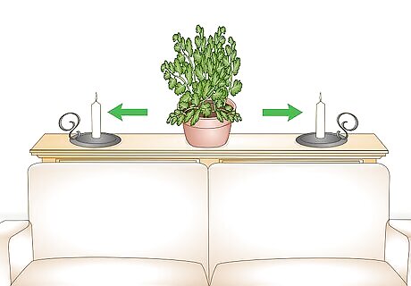 Balance the height of objects on the table. Create an aesthetically pleasing space distributing your decorations across the table in a symmetrical manner. The objects don’t have to be the same in order to create symmetry. Simply look for objects that are similar heights. For example, if you have a tall plant on one side of the table, place a tall candle or lamp at the other end of the table. Space apart the tall items so they aren’t all together.