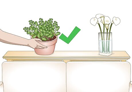 Pick a few favorite ornaments to add a personal touch to the table. Less is more when it comes to sofa tables. Keeping the space uncluttered will make the area feel peaceful. However, a few meaningful items will make the table feel more personal and less stark. Choose a few ornaments that are meaningful to you and match the colors in your living room. If there is a stack of books on your table, consider placing a small ornament on top of the stack. This will add multiple layers to the space. A pinecone, a small figurine, or a small clock are all good options. Switch out the ornaments each season to keep your decor looking fresh.