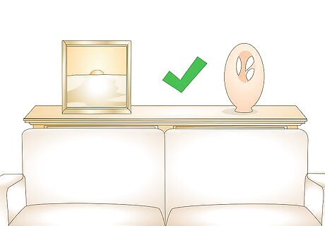 Add a lamp or 2 to create a warm atmosphere on your couch. Lighting is one of the most effective ways to create a pleasant atmosphere in a space. Position a lamp on one side of the table to create a striking look, or place lamps on either side of the table to make a symmetrical look. Choose light bulbs that have yellow tones instead of blue tones to create a warmer atmosphere. Choose lamps that fit with your personal style and match the colors in the rest of your room. Make sure the lamps are proportional to the size of your sofa table so they look good together.