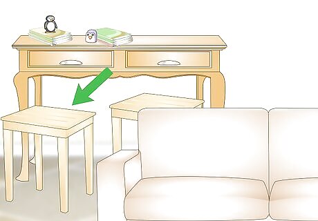 Place stools or chairs around the table if there is room. If your sofa table and couch are in the middle of the room, a good way to maximize the utility of the table is to add seating. This enables the table to be used as a dining table as well as allows you to pull out extra chairs when you have guests. Choose chairs that aren’t too chunky so that they don’t distract from the table. Place the chairs behind the table rather than at the side of the table. If you think that chairs will make the room look too cluttered, consider purchasing ottomans instead. These can be pushed under the table when they aren’t be used. Generally, 2 or 3 chairs will fit comfortably under most sofa tables. Add decorative baskets or store extra items under the table if it has a bottom shelf.