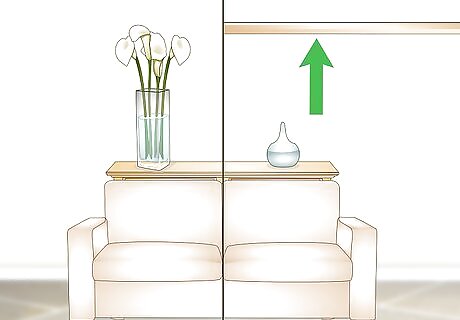 Add height to your sofa table if you have high ceilings. The side table will look most effective if the height of the objects on the table are proportionate to the height of the room. If you have low ceilings, keep the decorations on the table fairly low. If the ceilings are high, pick taller objects to display on the table. Consider stacking objects to create height. For example, place an ornament on top of a magazine box. Lamps, vases, and plants are simple ways to add height to the table.