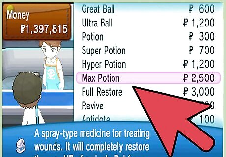 Be prepared. Before getting to the Elite Four, make sure you stock up on the Potions you'll need, status healers, and revives. You can buy them before going on Victory Road, or you can get them at the Pokémon League after getting through Victory Road. It's best to stick with getting Full Heals as opposed to just one of each type. It'll cost you less money and you can stock up more. Hyper Potions will work in a pinch, but the best potion to use is the Max Potion, as it will fully heal your Pokémon regardless of how much HP it has. It's best to buy more of each medication than you think you'll need. While it can be a little costly, you'll be grateful when your most trusted Pokémon keeps fainting or losing HP too quickly.