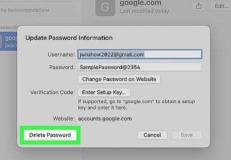 The Delete Password button is at the bottom-right corner of the window. This deletes this password from your iCloud Keychain, as well as from your Mac. It won't be stored on your iCloud account anymore. If you want to use this password again on any of your Apple devices, you will have to manually enter it. If prompted, click Delete again to confirm.