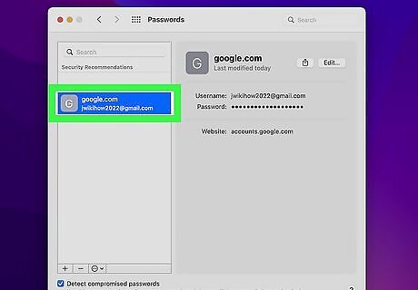 Click the desired account in the left panel. This displays the information you've saved for this website or app. The password is obfuscated by dots for your safety. You can easily search for a site or app by typing it into the "Search" field.