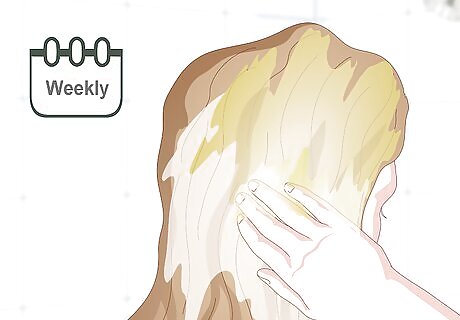 Use a hair mask once per week to maintain shiny, healthy hair. You can repeat this process regularly to promote your hair’s health. Most of the ingredients are probably already in your home, and you can experiment with adding in different ingredients to see what you like best. If you swim in chlorinated water or spend a lot of time in the sun, you could even use this mask every time you wash your hair. If you have thin or oily hair, you most likely won’t need to use this mask as often. Twice or once a month will probably be enough. If your hair feels greasy to the touch after using the mask, decrease how often you’re applying it.