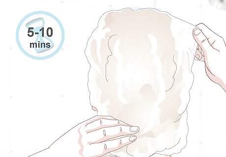Wrap your hair back up and set a timer for 5 to 10 minutes. Rewrap your hair in a towel or put your shower cap back on. If there is egg wash running down your neck, wipe it away with a damp cloth so that it doesn’t dry on your skin. Let the mask saturate the oil so it’ll be easier to wash off. Avoid leaving the egg wash in your hair for more than 15 minutes maximum, as it’ll start to dry after that amount of time.