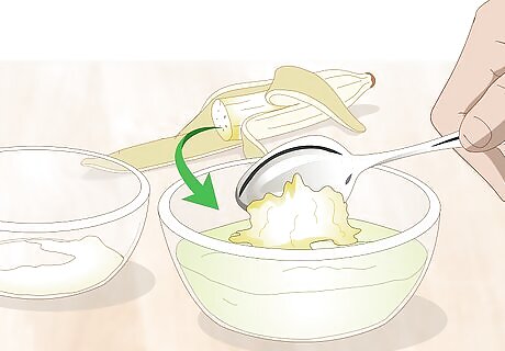 Include 1/2 of a ripe banana if your hair tends to be on the frizzy side. Put half of a peeled banana into a small bowl and use a fork to mash it up. Once it has been mashed, go ahead and combine it with the rest of your mask ingredients. Banana is a simple moisturizing element that you may already have at home.