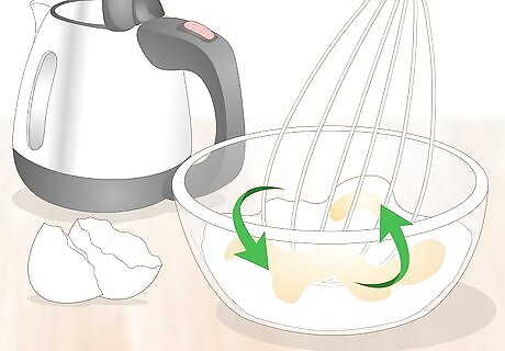 Make a removal mask out of a raw egg and warm water. Coconut oil can be difficult to wash out of hair—it’s thick and slick and usually needs more than a simple shampoo. In a small bowl, whisk together a raw egg and about ⁄2 cup (120 mL) of warm water. Keep whisking the mixture until the egg and water are completely incorporated.Tip: Avoid using hot water for this task. Really hot water could actually start to cook the egg, which is definitely not what you want to do.