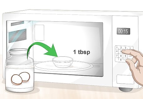 Warm up 1 tablespoon (15 mL) of coconut oil if it’s in a solid form. Coconut oil has a really low melting temperature of 76 °F (24 °C), so it doesn’t take much at all to melt it down. Put 1 tablespoon (15 mL) into a microwave-safe bowl and heat it up for 15 seconds. Getting the coconut oil into a liquid state will make it much easier to combine with the other ingredients.