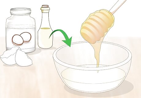 Mix together the coconut oil, olive oil, honey, and egg in a small bowl. Use 1 tablespoon (15 mL) of coconut oil, 1 tablespoon (15 mL) of olive oil, ⁄2 tablespoon (7.4 mL) of honey, and 1 large egg (separated or whole). Whisk everything together until it has all completely combined. If your hair is exceptionally long or thick, double the recipe.
