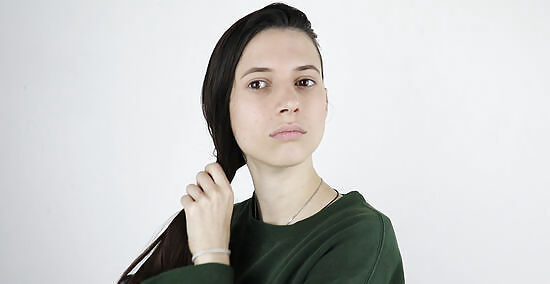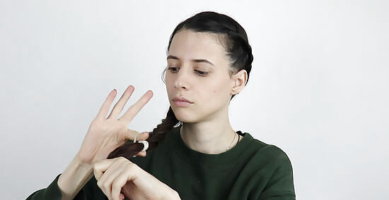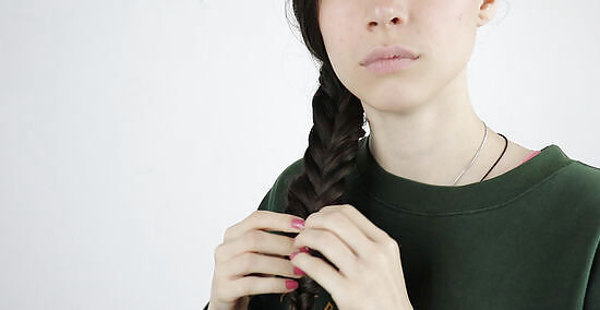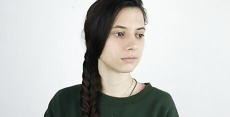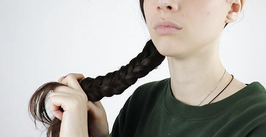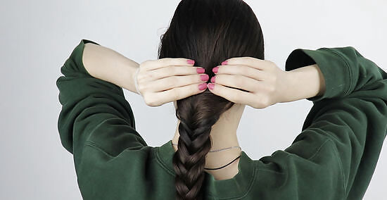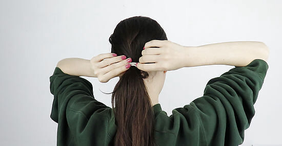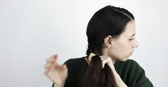 Begin the fishtail braid. Divide the hair into two even sections. Take a small section of hair from the right strand, pull it over the strand to combine it with the left strand. Now, grab a small section of hair from the left section, cross over to combine with the right strand. Once you have finished a level of the braid, pull tight by separating the two strands wide. Repeat this method as you braid along the ponytail. Make sure the smaller strands are incorporated into the two main sections. You should not have many smaller sections as you braid. An alternate way to begin this braid is to start at the top of the head. By starting at the top of the head, you do not need an elastic. You will start with two sections of hair. As you braid towards the nape of your neck, add sections of hair. You may need someone to help you braid if you are trying to complete this look by yourself.