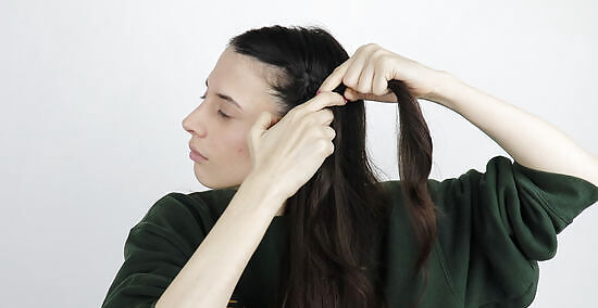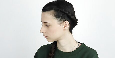 Begin French braiding. Take the three strands and French braid them. Take one of the outer sections and cross it over the middle section. Then take the opposite outer section and cross the strand over the middle section. This will give you a beginning anchor braid. As you continue to braid, add a small section of hair as you start each level. Add the hair from along the hairline in front, and from around your ear in the back. Don't add hair from the very back of your hair. Tie the braid off with a hair band when you get to the ear.