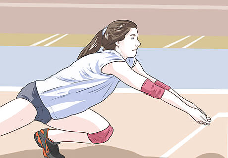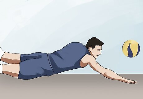 Land with one arm stretched forward. As you dive, stretch one arm out as far as you can. Keep your hand flat with your palm down, as though you were high fiving the floor. Aim to land with this hand pressed flat against the floor, exactly where the ball is about to land.