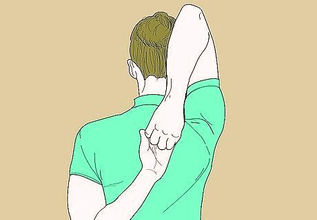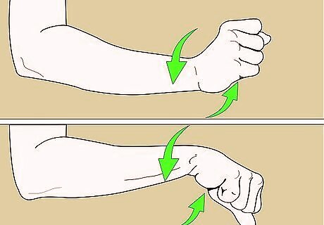 Stretch your wrists and fingers. Stretch your arm out and roll your hand around your wrist in a circle about 5 times. Ball your hand up and then stretch your fingers out 5 times, and then bend the wrist gently inward with the other hand. Repeat with the other side.