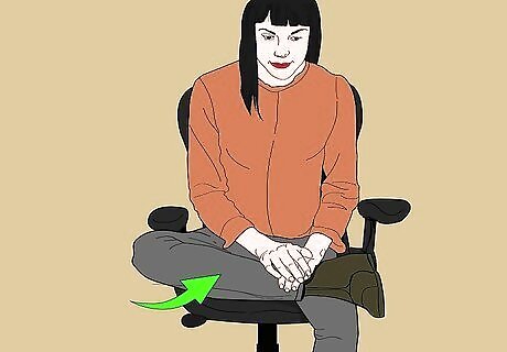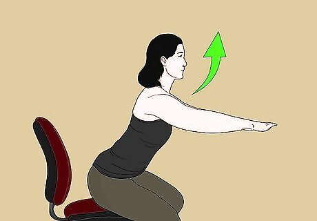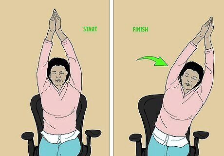 Use seated crescent moon pose to stretch your spine. Raise your arms over your head, and bring your hands together. Your fingers should be stretched out wide, not close together. Lean over to the left, and hold for a couple of breaths. Do the same on the right side. You can also lean over the arm of your chair to open up your sides. Reach your opposite hand over your body, holding the pose for 4-5 breaths. Then, repeat on the other side.