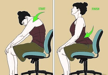 Use seated cat and crow to stretch your back and shoulders. Start with your hands on your knees.Your shoulders should be arched and your head should be tilted down. As you take a deep breath in, bring your hands back to your hips. Extend your chest and push your head back, arching your back and shoulders. Exhale as you bring yourself back into the hunched pose, dropping your chin to your chest. Try 3 to 5 repetitions. You can also do a seated child's pose to stretch your lower back. Place your elbows on your knees, then bend forward. As you relax, you can reach down to your ankles or the floor to deepen the stretch further.